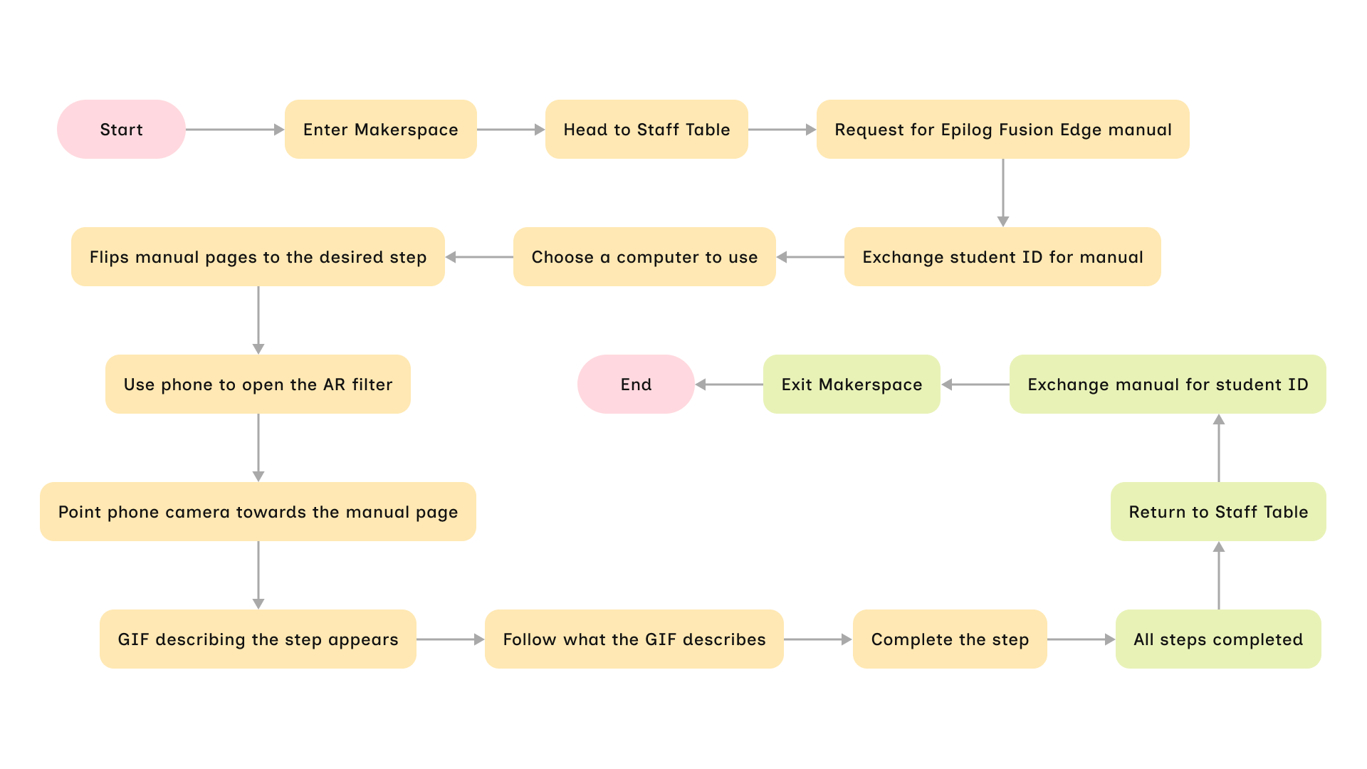 Crafting a user flow helps me ensure the user does not encounter any hiccups throughout the entire process of using my product. From acquiring the manual to leaving the Makerspace.
