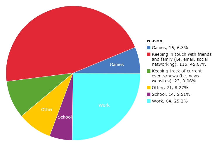 According to a survey on StatCrunch that gathered 251 responses, 46% of respondents indicated that they mainly used their computers for keeping in touch with friends and family such as email, social, and networking. The second most cited reason is work, at approximately 25% of responses.