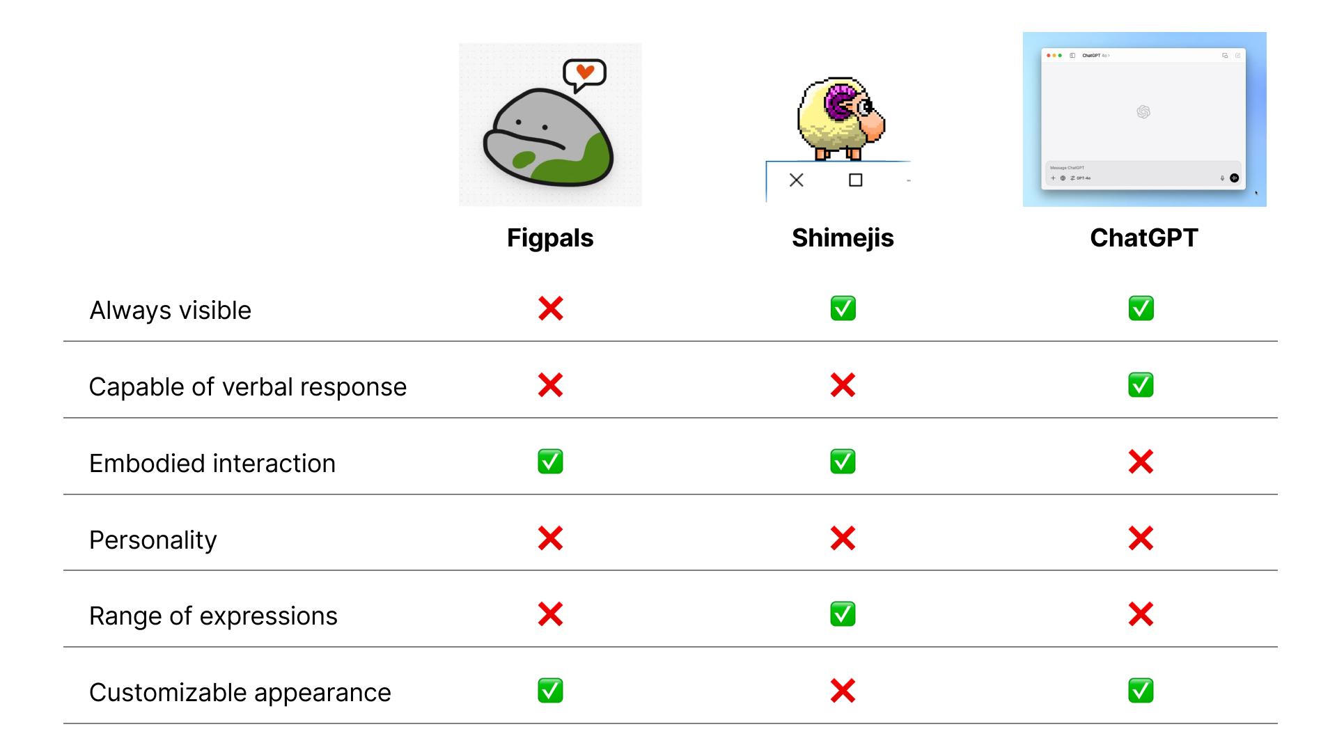 In terms of visibility, Figpals is not visible outside the app, unlike Shimejis and ChatGPT. ChatGPT is the only app capable of verbal response though text and speech. However, it does not have embodied interaction, it cannot be played with or petted with a mouse. All three products also do not have a fixed personality. Only Shimejis have a range of expressions. However, it does not have a customizable appearance, it is worth noting that ChatGPT has very limited customization options, such as simply changing the color of the window.