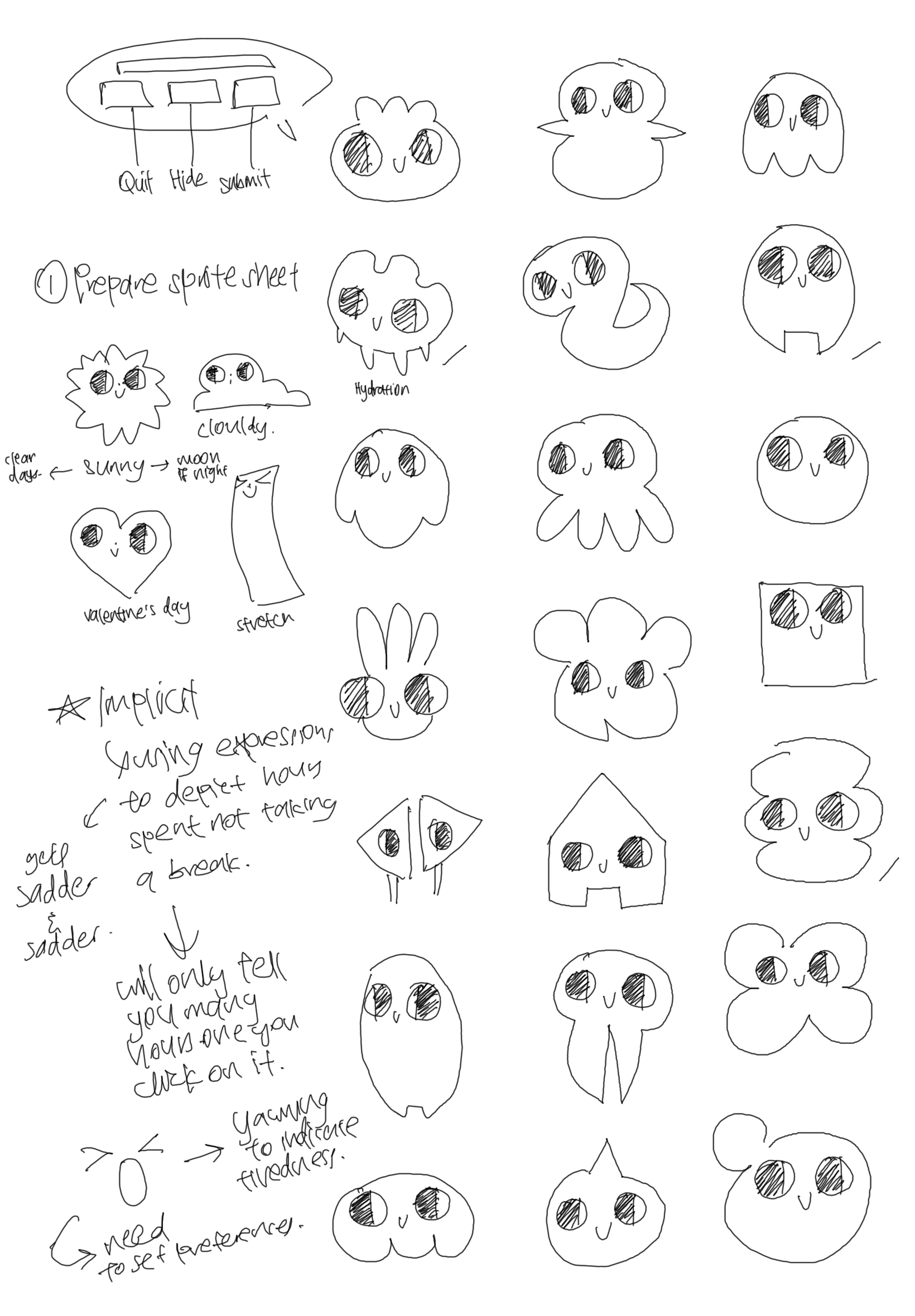 I started my character design journey with some sketches. I wanted the design of the MiniKin to be kept simple with a bold silhouette so that it does not distract the user, keeping a gentle low profile until they are needed.