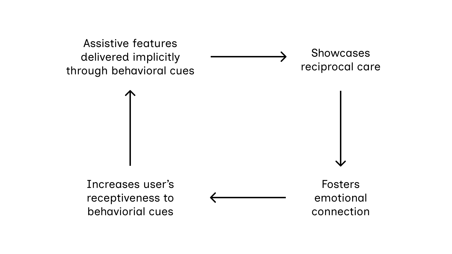 This suggests that my proposed cyclical relationship between emotional connection and implicit interaction (shown below) may hold, potentially enabling virtual pets to sustain longer-term engagement than conventional interfaces.