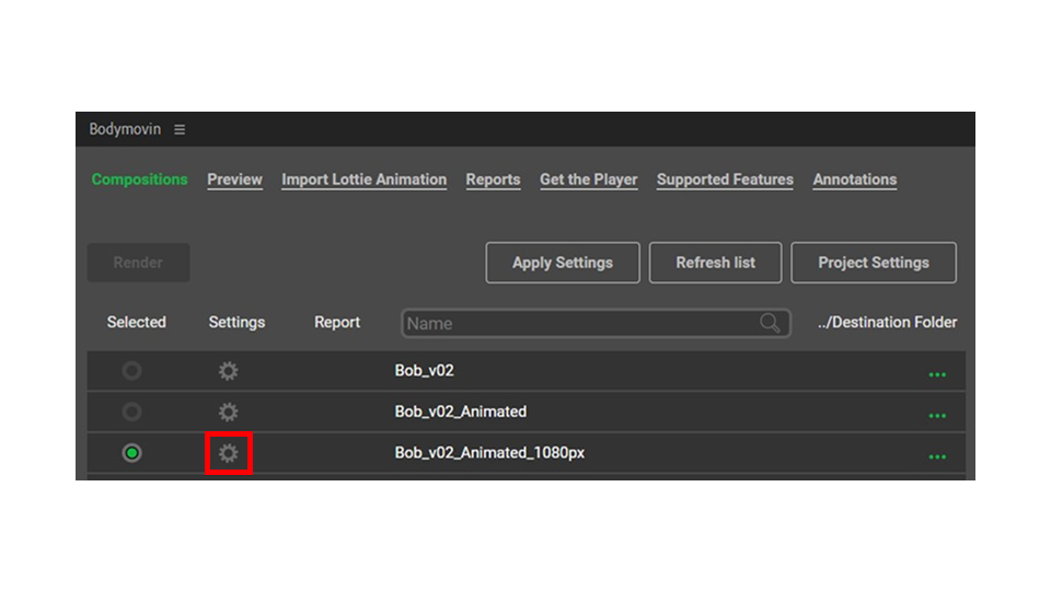 Click on Settings (the gear symbol) of the composition you want rendered.