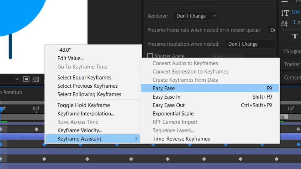 Tip: If you want to add a simple easing, click and drag your mouse over the keyframes, right click on them, hover over ‘Keyframe Assistant’ and click ‘Easy Ease’.