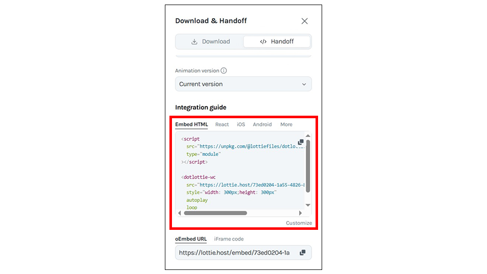 Under ‘Integration guide’, copy the code under Embed HTML and paste it into the code of your website’s .html file.