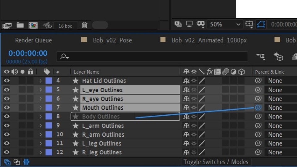 For example, I want Bob’s eyes and mouth to move together with the body. So I select all those layers, click on the pick-whip icon and drag my mouse towards the parent later, which is the body.
